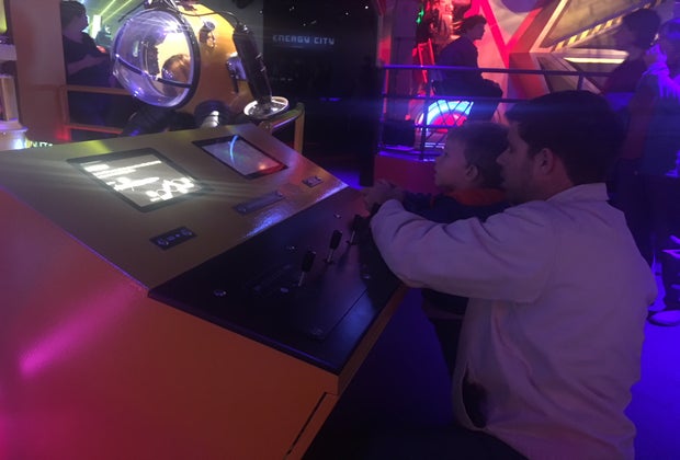 While they were busy traveling around oil country in Texas, my daughter and I wandered over to check out "Energy City," a 3-D model of Houston. It's hard to really involve a 1-year-old in a museum experience, but she was entranced with Energy City. The 3-D model is made from projections that transform the miniature city from a mass of white buildings and terrain to one that is alive with different colors of energy chains. We were both immersed in watching the cityscape change over and over again. While we waited, I also took a test to see which energy-related jobs I was qualified for (interestingly, my love for the outdoors landed me on jobs like a roughneck several times), and once they were back we played and gawked at the different equipment and displays for much longer than I thought would hold a toddler boy's attention.