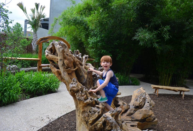 Outside, when the weather is good, there’s plenty going on. There’s a sand area where kids can build with buckets and tools, a giant tree house, and a shallow manmade stream to get your toes wet. My son happened to be wearing swim trunks which was fortuitous because, boy, did he get wet.