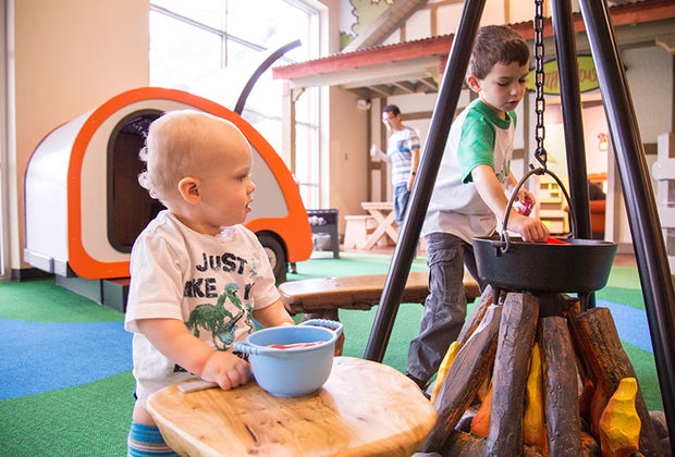 Learning how to set up camp at the indoor campsite exhibit/ Photo courtesy McKenna Children's Museum