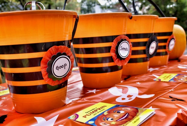 Set up a pumpkin carving station for a social distancing game.