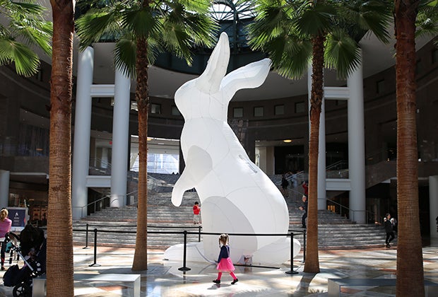Kids will love gawking at these gigantic post-Easter balloon bunnies set up in Brookfield Plaza. Photo by Mommy Poppins.