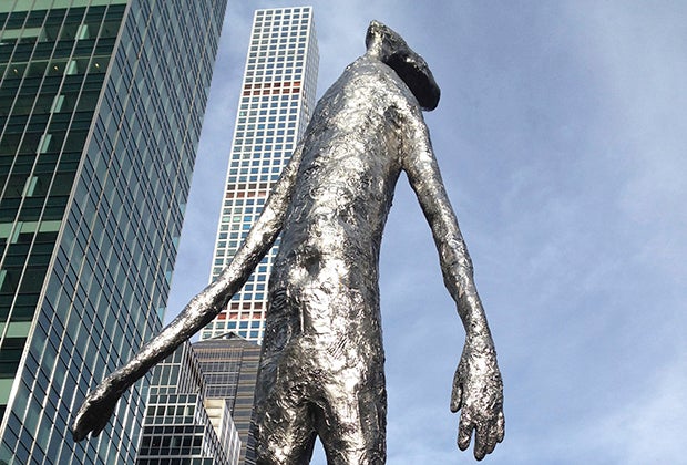 Tom Friedman's towering humanesque form on East 53rd Street fits right in among Park Avenue's glittering skyscrapers. It reminds me of a tourist gawking at tall buildings, but it should remind all of us to look up in awe every now and then. My son thought this 33-foot man looked like he was built from crumpled tin foil. He was almost right: It's created from disposable aluminum roasting and baking pans–you can still see some of the ridges from the pan on the statue.
