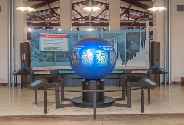 The World Migration Globe on view at the Peopling of America Center on Ellis Island; photo courtesy of the Statue of Liberty-Ellis Island Foundation, Inc.