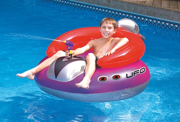 Up the fun factor with this ride-in spaceship float for kids from Swimline. It's part float, part pool toy as it comes equipped with a squirt gun to ward off alien invaders, intergalactic hooligans—and pesky siblings.