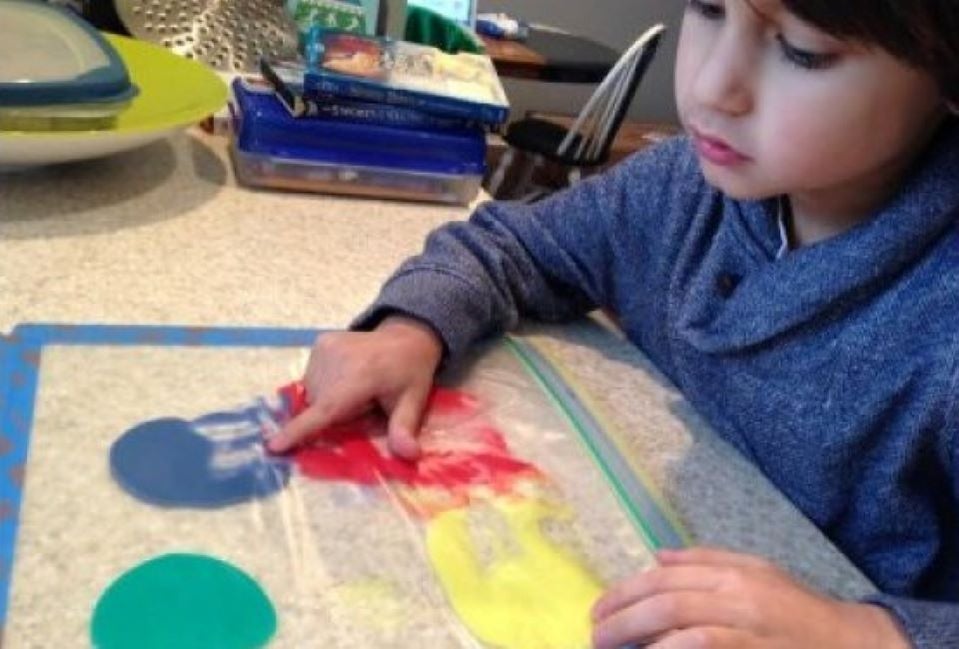 They can use fingers or experiment with other tools like cookie cutters or a rolling pin. When the art is done you can tape it to a window for a stained glass effect if you want. As a variation, try putting a photo or page from a magazine below the bag before you tape it down.