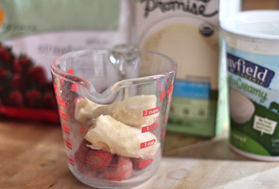 2. Add a few scoops of yogurt and a splash of milk. I use plain, nonfat yogurt, but you can use whatever kind you like. Almond or soy milk or juice are all also good.