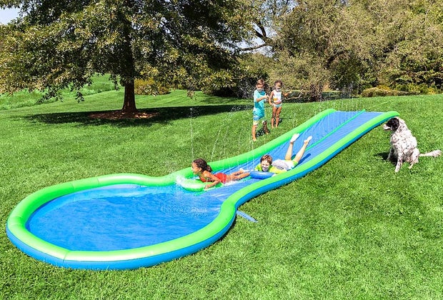 One mom we know swears by this Intex water slide, especially because of it's pre-pandemic low pricing. It's sturdy and loads of fun for elementary-school-age kids. The water slide comes with two inflatable surf riders so everyone can ride in style.