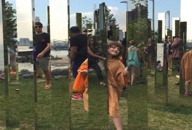 Located just south of Pier 2, "Mirror Labyrinth NY" is a circular maze of vertical, polished, stainless steel planks of different heights arranged to represent and reflect the New York City skyline. But without a doubt, the most popular work is Pier 1's "Appearing Rooms," a raised platform with vertical jets that shoot out seven-foot walls of water to create "rooms." If you're careful, you can move from room to room without getting wet (but leave your phone with a friend anyway). Needless to say, my kids had no intention of staying dry and had a blast straddling the rooms.