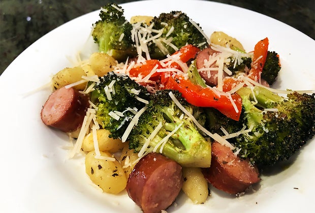 Put your veggies on the pan. With this meal, my kids like broccoli, and I add chopped red pepper for a little color (on one corner of the tray, so my son doesn’t have to eat it!). It’s also great with any combination of onions, mushrooms, or cherry tomatoes thrown in the mix. Drizzle the vegetables with olive oil and rub it in well, making sure you get oil all over the pan, too. Scoot the veggies to one side of the pan, and put the sausage (we like smoked chicken apple sausage because it’s sweet, but you can use any flavor your kids like), sliced into ¾ inch chunks in one corner. In the other corner put your gnocchi. Drizzle the gnocchi with melted butter and then broth, and sprinkle the salt and spice mix over the vegetables and gnocchi.