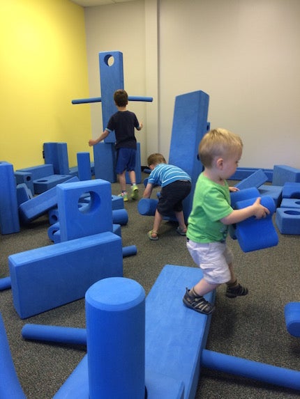 After snacks, we ventured back in where I found yet another room I'd missed, entirely devoted to tinkering. Screwdrivers are at the ready to take apart and reconstruct phones, printers, etc. Most of my crew is too young for this, so we agreed to save that for a time when Daddy was along (and I promptly pried the tools out of their hands). Thankfully, the final room was full of large, lightweight Imagination Playground construction blocks, where they weren't sure whether to build, or throw themselves around. Fantastic.