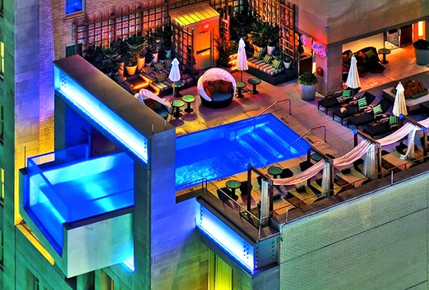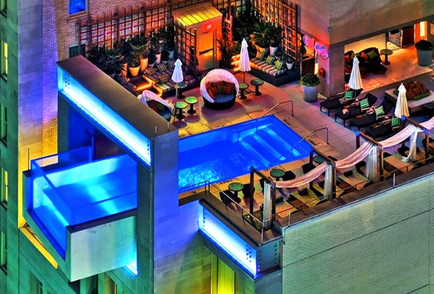Daredevils will get a kick out of hanging eight feet over the edge of the hotel building, 10 stories up, thanks to a clever cantilever design by Adam Tihany. The outdoor, heated pool at this Dallas hotel has a solid bottom but plexiglass wall, allowing swimmers to check out surrounding skyscrapers and the street below. It is closed during the fall and winter.