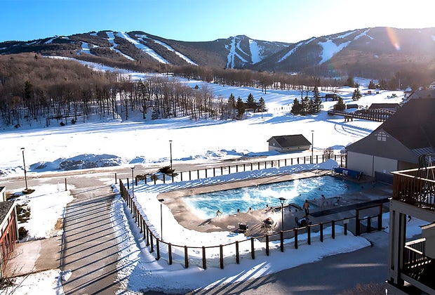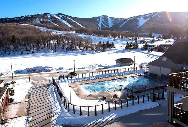 The winter experience at this slope-side Vermont resort is hard to beat. Ease into the heated pool indoors, then swim through a plastic barrier into a steamy 75-foot outdoor pool. Kids will have a blast jumping from the snow piles into the pool. They’ll also get a kick out of people wearing ski caps in the pool. The view of the Killington ski resort towering above makes it picture-perfect.