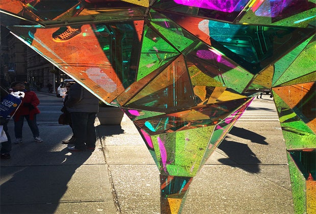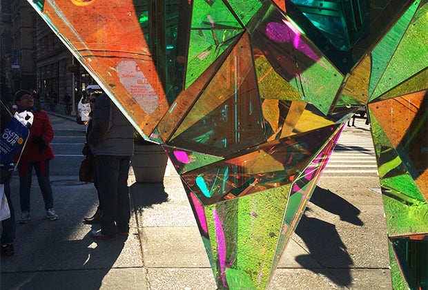 The colorful glass panels are hard to miss, attracting kids, tourists and office workers on lunch break toward the pedestrian plaza near Madison Square Park.
