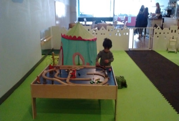 Adults can actually enjoy a cup of coffee without taking their eyes off the play area. The coffee bar features freshly brewed joe, plus tea, cold beverages and snacks. Healthy treats for the kids, such as goldfish, applesauce, and milk are available as well. Grab a magazine from the counter to read while you’re there. If the kids decide to join you at the tables, there are coloring sheets and magnetic toys. Plus, a cool rice table, similar to a sand table, is housed in the cafe area. The cafe also provides room for coats, strollers and shoes, which need to be removed in the play area.