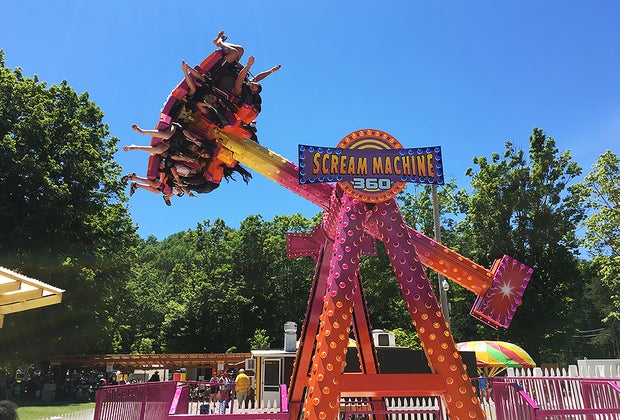 Land of Make Believe’s newest attraction, Scream Machine 360, sits smack-dab in the middle of the park. You can’t miss it: The giant pink and orange pendulum swings and lifts riders, all the while spinning seats upside down, offering a higher octane of fun for bigger thrill seekers and older kids.