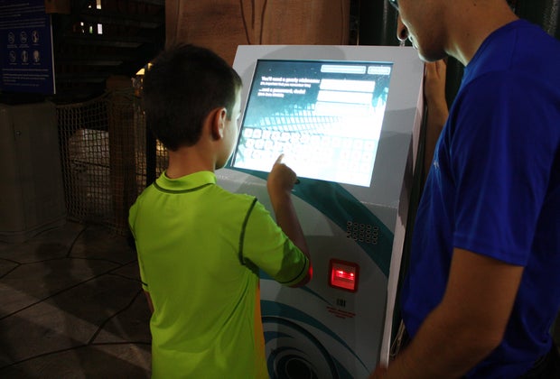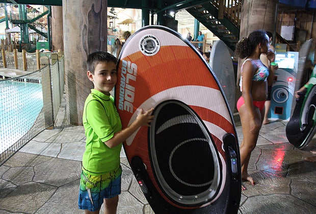 Which brings us to the lines: Like all popular attractions, Great Wolf has its share of long lines—irritating but inevitable lines that can occasionally be exacerbated by mechanical mishaps (my husband and son waited 45 minutes for one ride after a slide went out of order). Slideboarding requires an initial three-step registration process. First you must register your nickname and password at one kiosk, and then you travel to another kiosk to link your Slideboard to the account. Right before you go down the slide, another attendant links the board again to your ride. (This process drops down to the last two steps for all rides after the first one.)