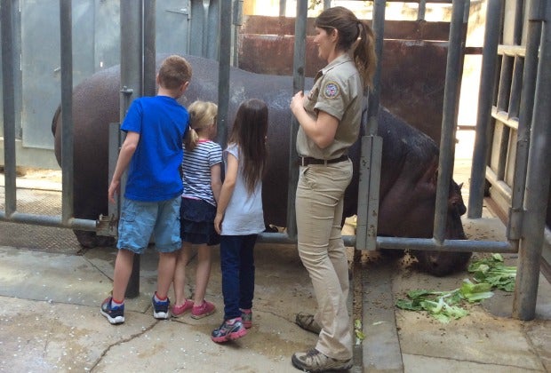 The Hippo Encounter gives zoo visitors a chance to go behind the scenes, to an area that is normally off limits to all except zoo staff. The stars of the show are 12 year old hippo Mara and her baby, Rosie. (Daddy Adama stays outside in the family enclosure; you can catch up with him later in your visit.) Mara and Rosie feast on greenery, melons, and other crunchy treats while kids pepper the zoo staff with questions. Details are shared on everything from the care and feeding of hippos to the family secrets of the Zoo’s trio. (True fact: Mara and Adama were not intended to be mates, and in fact Mara was on birth control when they met. But love finds a way, as Rosie’s birth on Halloween 2014 attests!)