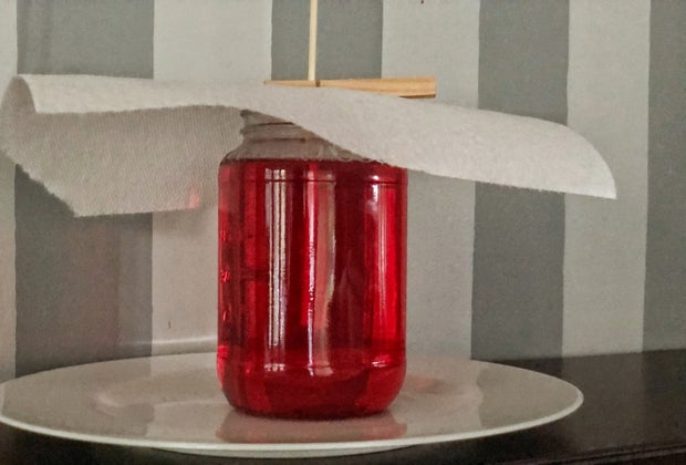Once in place, secure the stick in place using a clothespin. Cover the top of the glass with a paper towel. You may have to poke a hole in the paper towel for the wooden stick to poke through.
