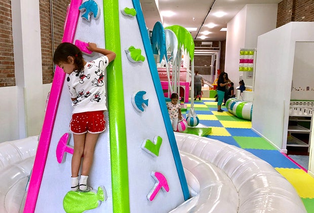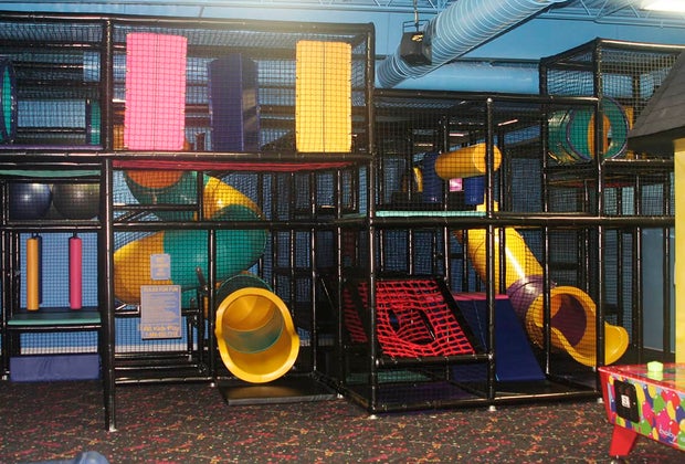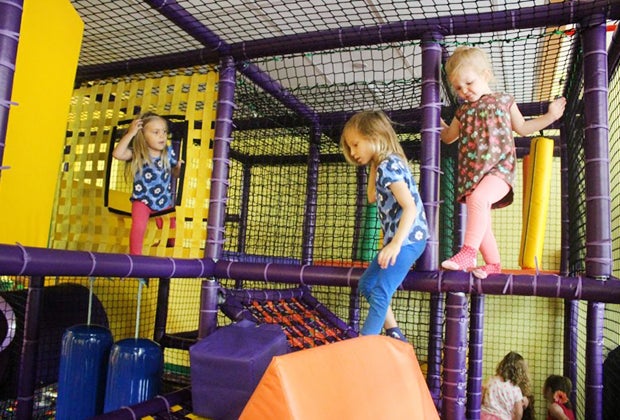 This indoor playground invites little ones to jump on the trampoline, and crawl, climb, slide, and wriggle through a colorful maze of play equipment.