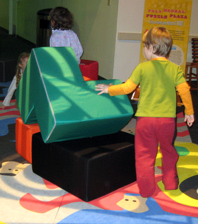 By far, the number one attraction was the Polyhedral Puzzle Plaza, a geometry lesson hidden in giant, soft foam shapes that were meant to be put together to form a cube. The cube never materialized but lots of creative building, climbing and jumping went down, instead. It was hard to pull them away from this part of the exhibit and eventually I stopped trying.