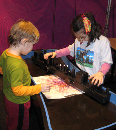 The kids really liked the entire midway: balancing a “teeter totter” pirate ship with weights, playing with lasers, spinning the roulette wheel to learn about probability, trying to find the exit on a big maze without making a left or backtracking, and the mysterious harmonograph that created mathematical art with markers and a pendulum.