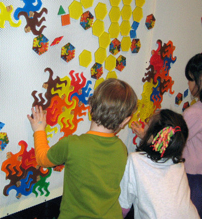 Miles of Tiles, a giant magnetic board with an unlimited amount of colorful interlocking monkeys and geometric shaped magnets was also a huge hit with the kids. They probably spent 30 minutes creating new shapes and patterns here. So was Mirror Morph, fun house mirrors with curvature that we could control by pulling on a chain to experiment with our reflections.