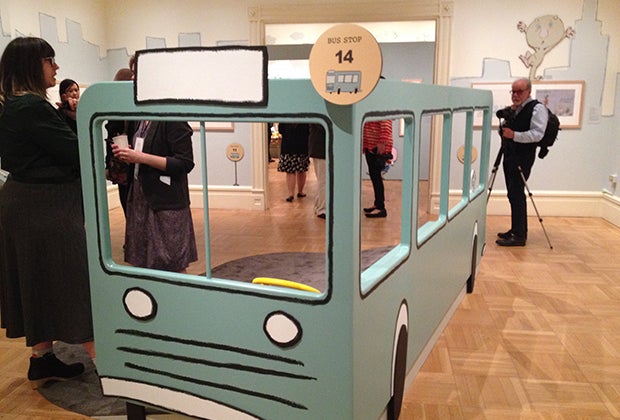 The "pigeon bus" serves as a mid-gallery reading nook, stocked with Willems books. Photo by the author.