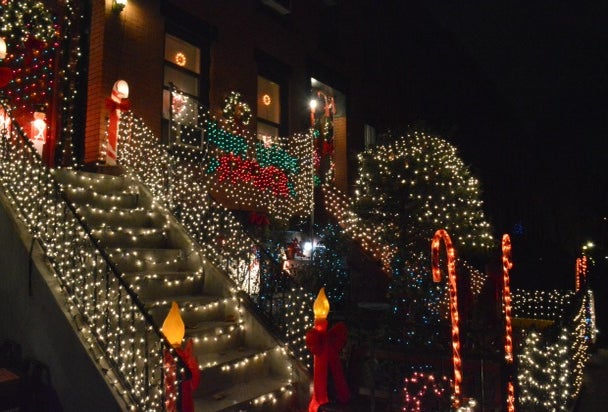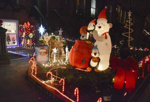 The light displays at these adjoining brownstones look like they belong in Dyker Heights. Every inch of the facade and front yard has been wrapped and decorated. Christmas music plays all day.