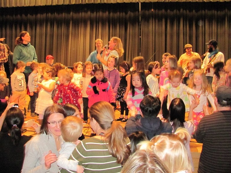 For the last song (a reprise of the first one, “I Wanna Be a Jitterbug”), Karen invited kids to join her on the stage. She seemed a little surprised when nearly all the children from the audience climbed up on the stage and crammed into the small open space around instruments. Then, along with Karen K and the Jitterbugs, the kids sang, wiggled, shook and jiggled while their parents beamed at them from the audience and tried to decide whether they should pull out their cameras or put a hand out to make sure no one fell off the stage (some did both – we parents are highly skilled multitaskers).