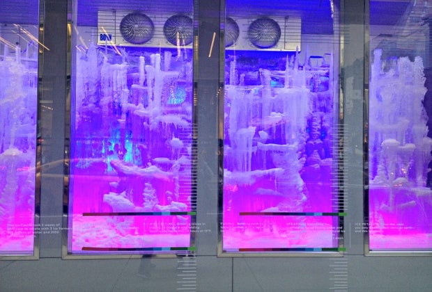 As usual, Barneys' windows are an over-the-top conceptual experience. "Chillin' Out" features four impressive displays, including one with live ice carvers from the renowned Okamoto Studio working in a specially created glass-fronted ice locker. You can catch their show Monday-Wednesday, noon-7:30pm, Thursday-Saturday, noon-8:30pm and Sunday, noon-6pm. The second window, also a specially refrigerated room, is home to an enormous ice formation created by ice farmers using 500 gallons of water. The free-form sculpture gets sprayed down with water regularly, so it's constantly morphing and changing as it freezes. A highlight is "Winter Brilliance," a gorgeous sculpture by famed glass artist Dale Chihuly, lit with changing colors that evoke snow in various natural lights. The last window was a favorite with the kids—a mini raceway called Arctic Chase with tiny, bedazzled 3-D printed Lexus autos racing through a slick, modern cityscape.