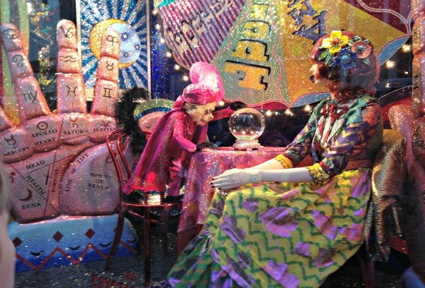 While Bergdorf's windows are stylish, they aren't the usual over-the-top affair we have become accustomed to. The retailer partnered with Swarovski this year to create a display it calls "Brilliant." The five opulent and glittering windows are far from traditional (not a Santa or tree in sight), opting instead for glammed up clothing and millions of sparkling crystals. Our favorite window is above, a fortune-telling monkey and the colorful, spinning roulette wheel.