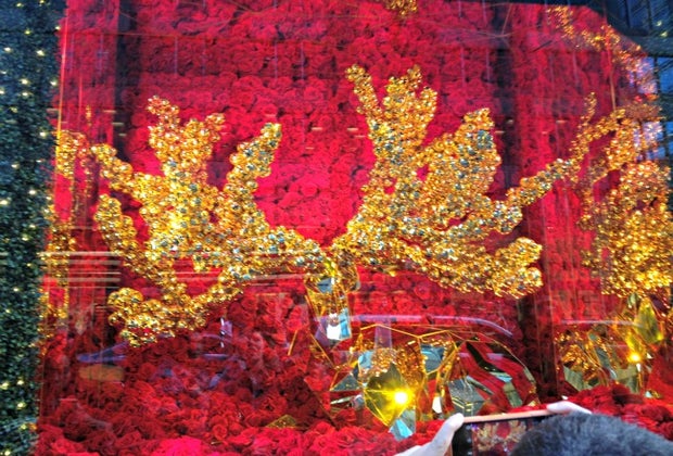 A shiny red reindeer shakes his head letting visitors hear the jingle bells on it's gold antlers in Bloomingdale's multi-sensory display.