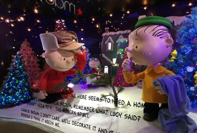 Top image: Charlie Brown and Linus pondering the true meaning of Christmas in Macy's windows celebrating the iconic cartoon's 50th anniversary. All photos by Mommy Poppins.