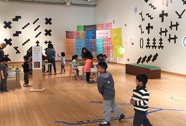 The exhibit offers several interactive elements, including a building station and a cloth "neighborhood" that kids are encouraged to walk through.