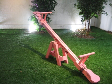 The park is actually three different rooms, the first is the smallest with a bona fide wood picnic table in the corner nestled among the trees and bushes. Downstairs is a large room with skylights in its super high ceiling, another park bench, a lawn for sitting among the trees and a bright pink teeter totter. Off this room is the “back” room, which is the most crowded, but also the most interesting. This room has realistic photo murals on the walls to give the illusion that you are in a forest, a pond (full of coins from wishers), giant rocks and huge black and silver fat boys cushions to lounge on. This room also has a small alcove with a wood chip floor and park bench seating. I saw adults reading, picnicking and chatting as well as a toddler exploring the place.