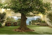 park here is the perfect oasis for a dreary and cold day in the city and there is no admission charge. Inside the 4,500 square foot space you will find grass, trees, birds twittering in the background and it is sunny and warm. Although nothing in the temporary park is natural and there are trappings of its urban space on view (heating ducts, pipes, white painted brick walls and electrical outlets) the experience truly is, well, natural. It has everything a park has just inside instead of out. As soon as you cross the threshold you will notice it is very quiet, with pre-recorded birds twittering from cleverly camouflaged speakers. There is astroturfy grass on the floor along with wood chips and strewn faux fallen leaves and the bright, hot heat lamps in every nook and cranny make the place feel warm and look sunny.