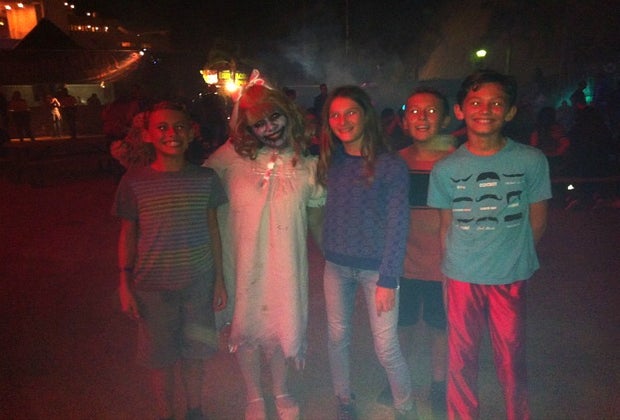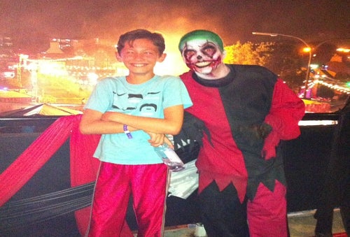 Best of all for the concerned parent, the zombies, creeps, and ghosts who haunt Dark Harbor do so in good spirits. This is a safe place to bring an older kid who thinks he's ready to be scared but isn't entirely sure. There are no mobs of chainsaw wielding murderers chasing guests up and down the streets. There are characters: ghosts with names like Scary Mary and Gail who float (or burst) in and out, barnacle-faced sea captains, creepy clowns, and guys who slide on their knees throwing sparks as they skid. Any of these might jump out and startle at any moment, and several of them stare and snarl menacingly, but it's all done in fun. Scary Mary, the murdering little ghost girl, even rode the giant swing ride with our kids (a $5/ride "thriller" from Michael Jackson's Neverland Ranch). And when spooks inside one maze saw how much fun our crew were having screaming, they ran alongside the kids screaming with them, until all of our sides nearly split from laughing.