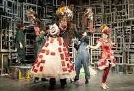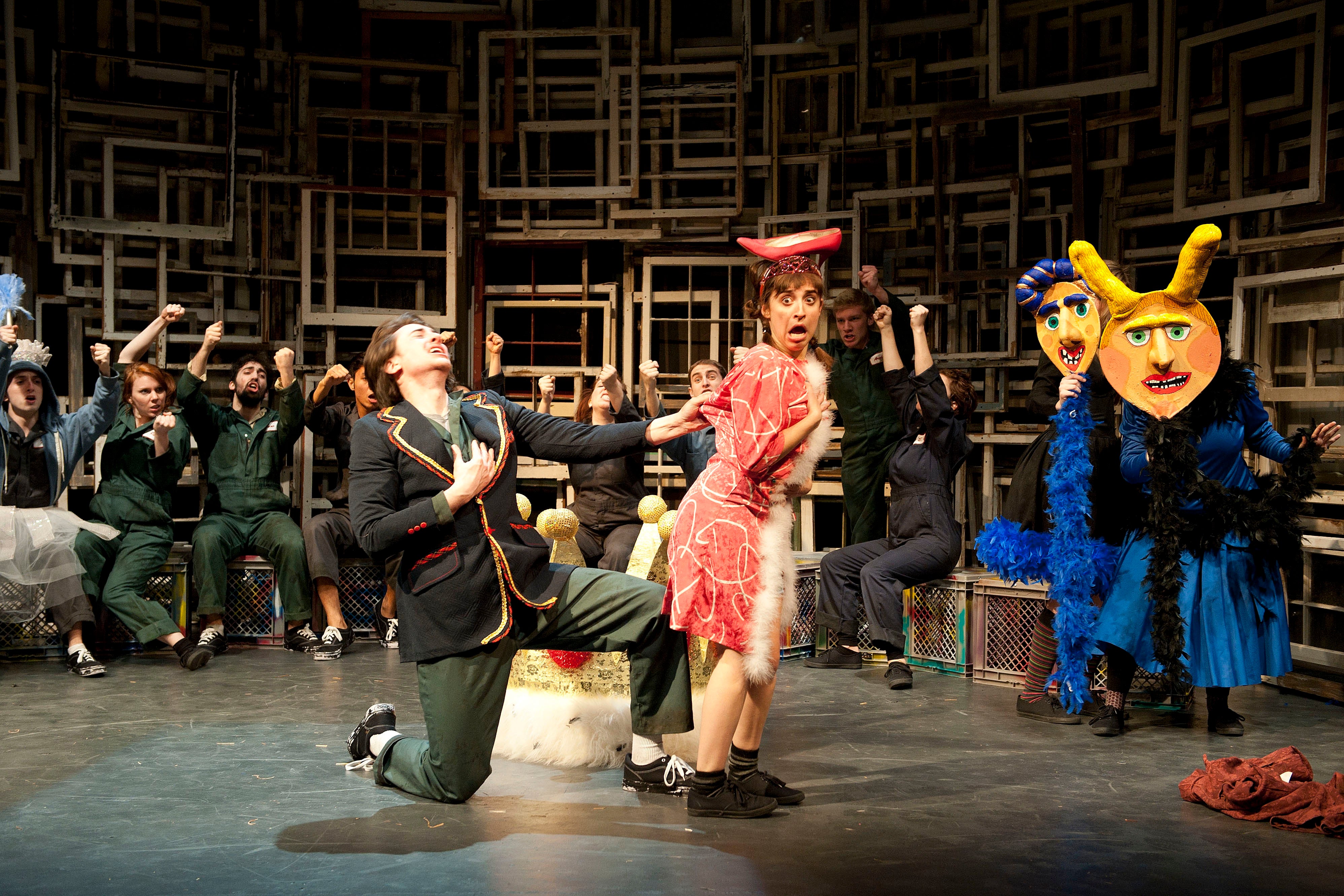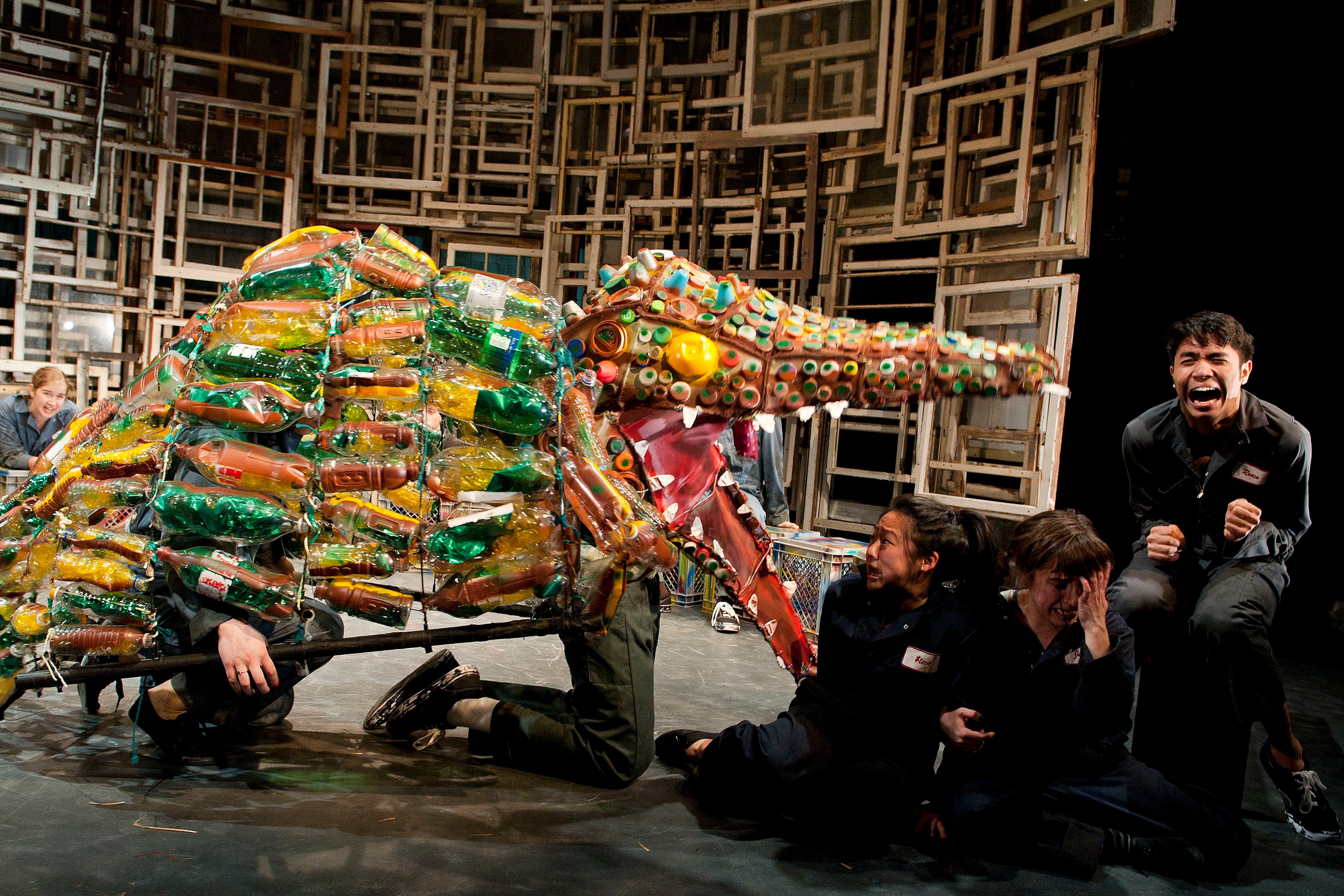 The staging is brilliant. The energetic ensemble members rush around playing multiple characters, making incredibly quick costume changes and manipulating puppets, notably a huge crocodile, which seems to be made from chicken wire and recycled plastic bottles, and a Mummenschanz-like lion, with hands for its eyes and mouth. Puppet designers Molly Deale and Federico Restrepo deserve props for their amazing work.