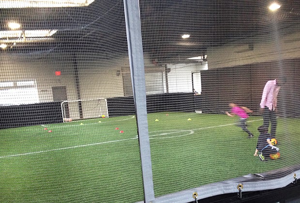 The Pitch is dominated by the netted playing field. There are few bells and whistles, but it has thought of everything a player needs to hone his or her skills or pick up a quick match. Coaches are nationally certified, including its head coach, who is from the New York Red Bulls Academy. Behind the field are a comfortable spectators area, changing rooms and a wall of lockers to stash belongings. The space has an outdoor feel to it, thanks to its five skylights, and is equipped with safety precautions, such as padded walls and soft, joint-friendly turf.