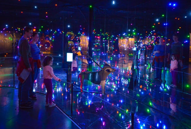 The Secret World Inside You guides visitors through a light room for a sense of the vastness of the microscopic universe on and in you. Photo courtesy of AMNH/D. Finnin.