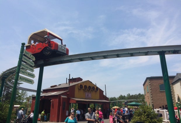 Cranky's Crane Drop is not for the faint of heart. There was no way we were going to attempt that one (the ride up looks smooth, but it bounces down fast and hard). Get shaken up by Toby's tilting tracks instead. Or choose to simply watch as I did!