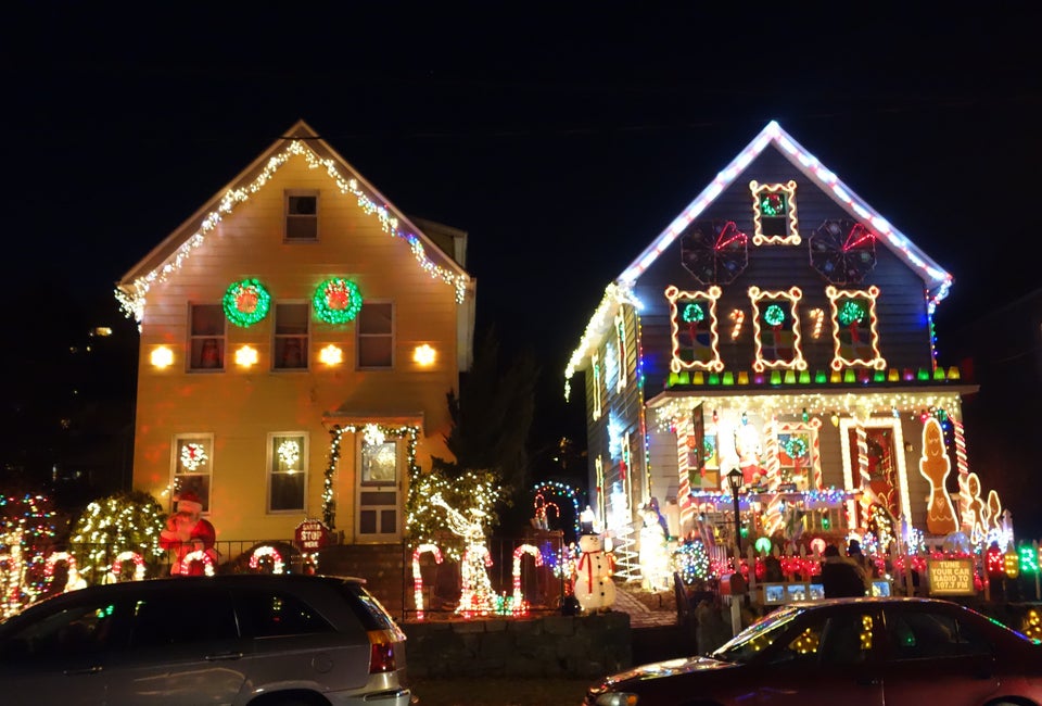 Though this residential light show is up all season, a nice diversion on the eve of Santa’s arrival is a visit to this multi-family spectacle. The house displays are synchronized to music, which you can listen to in your car. Every few minutes, Santa appears in the attic window. Unusual and FREE!