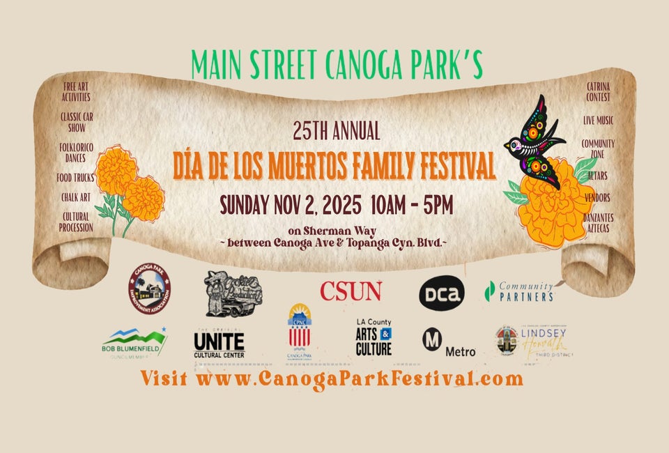 Canoga Park's annual Día de los Muertos Festival fills Sherman Way between Canoga Avenue and Topanga Canyon Blvd. with all manner of Day of the Dead entertainment. Booths line the street; highlights include traditional holiday altars and ofrendas, a catrina contest, and a cultural procession.