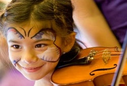 During the hour before a concert in the Symphonies for Youth series, the entire concert hall and its surrounding areas are alive with more kid-friendly activities than anyone could possibly do in a scant hour. We stepped off the escalator and were instantly drawn into a well-organized craft project (with a planet theme). There were signs guiding people to other rooms and other floors where families could take dance lessons, enjoy interactive storytelling, or fiddle around at an instrument petting zoo. Meanwhile, outside the hall, astronomers from the Griffith Observatory had set up a special telescope that allowed kids to safely peer at the sun from up close.