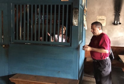 My daughter, laughing as she's locked behind the bar in Historic Richmond Town. Photo courtesy of the author.