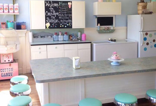 Kids can make their own sundaes in a retro style ice cream parlor.