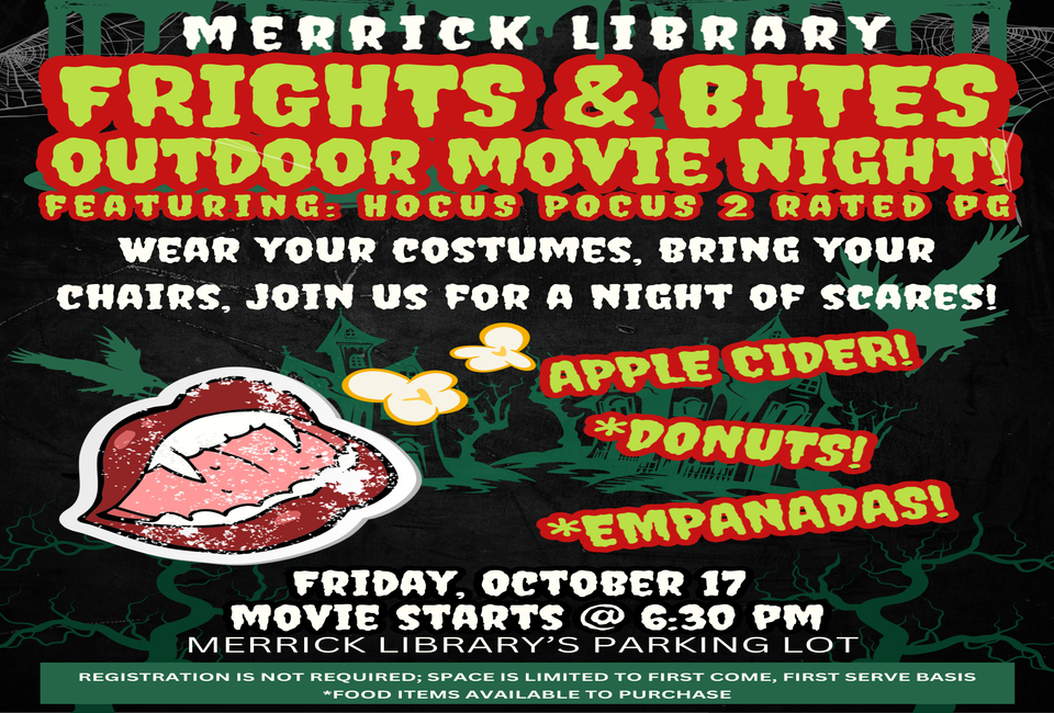 Wear your costumes, bring your chairs, and join us for a night of scares because the Merrick Library is running amok, amok, amok with its Frights & Bites Outdoor Movie Night, featuring a showing of Hocus Pocus 2.