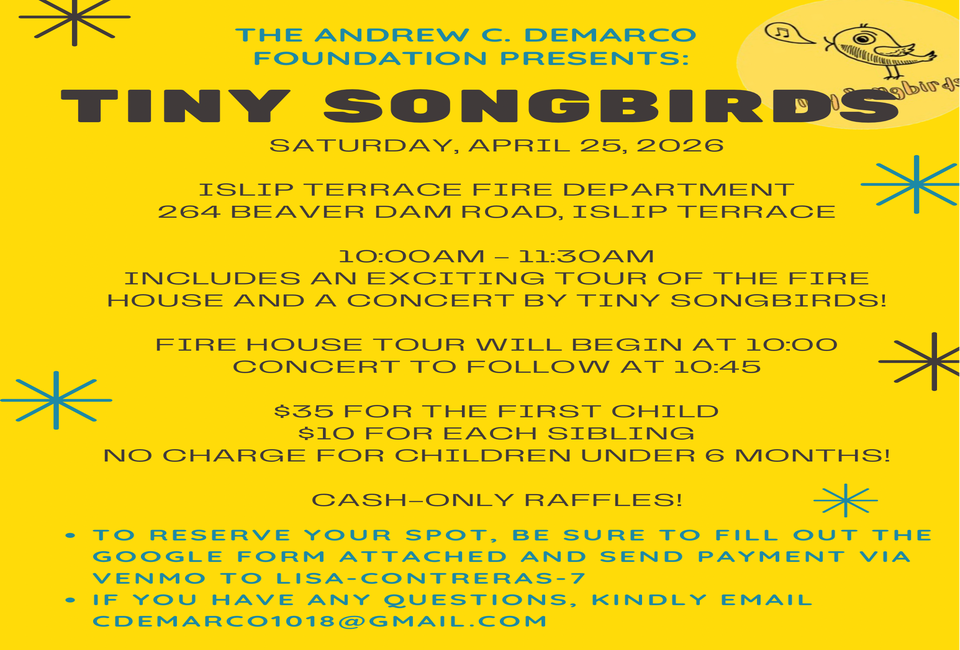 Join us on Saturday, April 25, 2026, at the Islip Terrace Fire Department for a tour of the fire house and a concert by Tiny Songbirds.