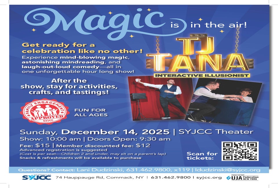Bring the family for a joyful Hanukkah celebration filled with wonder, laughter, and hands-on fun! The morning begins with an engaging, hour-long performance by illusionist TJ Tana, whose interactive magic, mindreading, and comedic surprises keep audiences of all ages entertained.