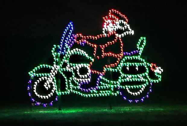 Upon entering the Calverton show, eager kids can ask adults to turn their radio stations to 104.7 WELJ, where spirited carols accompany the magical drive through the displays. A Frozen castle, Santa on a motorbike, and a hockey player are artfully created from a kaleidoscope of twinkling lights.